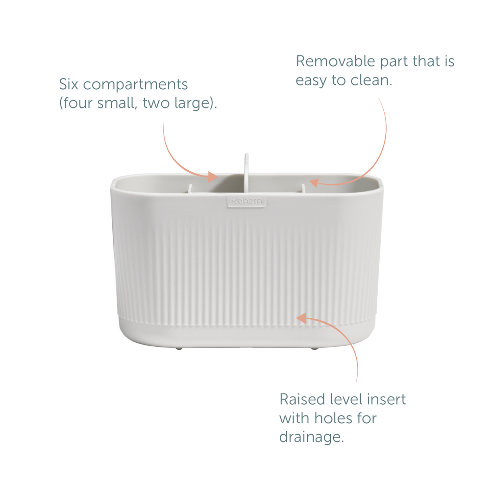 The ReBorn Bathroom Organizer Bundle includes the Large Bathroom Caddy, Soap Dispenser and the Soap Dish. The Bathroom Caddy has six compartments (four small, two large) and a raised level insert with holes for drainage and is easy to clean with removable parts. The ReBorn Soap Dispenser is an easy-to-use one-handed push pump, that is refillable with 250ml capacity and a wide base for stability and removable top with tight seal and the Soap Dish is designed to help dry soap quickly and has a smooth surface that is easy to clean. Made in UK from 100% recycled material.
