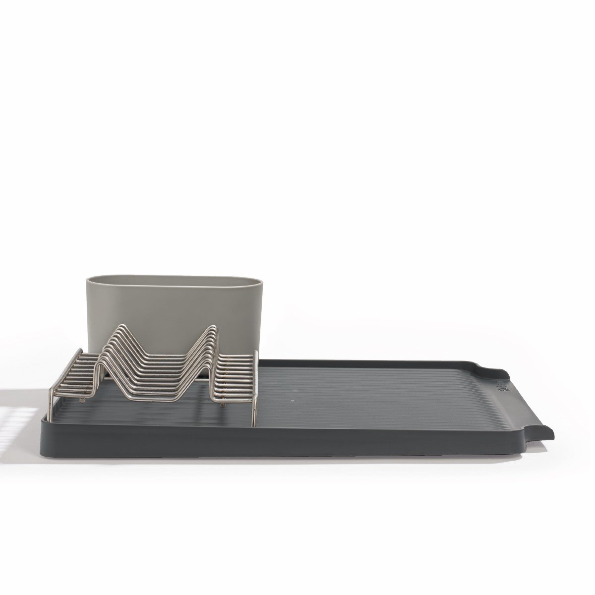 Draining tray has sloping ribs that channel water down and out over an integrated pour spout straight back into the sink